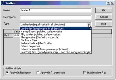 在“散射”文件夾中包括了默認模型和用戶自定義的散射模型,這些模型都可以應用于FRED的任何表面上。根據入射角度以及局部曲面法線的方向,每個模型計算出合適的三維雙向散射分布函數(BSDF)。BSDF的另一種定義方式是雙向反射分布函數(BRDF)以及雙向透射分布函數(BTDF)。
