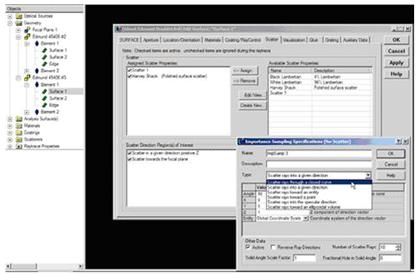 圖13 應用于一個特定表面上的重點采樣定義選項。如圖中所示,多重散射特性和多個重點采樣目標可以一起運用。注意到該圖中,該面同時定義了MIE散射特性和Harvey Shack拋光面散射,并且還定義兩個重點采樣目標,一個指向表面,一個朝向焦平面。