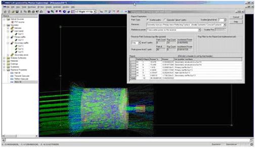 完成一次高級光線追跡以后,只要選擇生成光線歷史文件選項,FRED就會生成一份雜散光報告。這樣就可以從工具菜單中得到一份詳細的雜散光光線報告,該報告將指出鬼像以及散射光路怎樣到達任何一個表面。圖14所示的高級光線追跡對話框中,可以看到該對話框有設置/運用光線歷史檔案的選項并勾上了“確定光線路徑”的選項。圖15顯示的是一個簡單的卡塞格林望遠鏡系統的雜散光光線報告,該報告詳細說明了雜散光是怎樣以離軸5度的視場從光源射入的望遠鏡的。