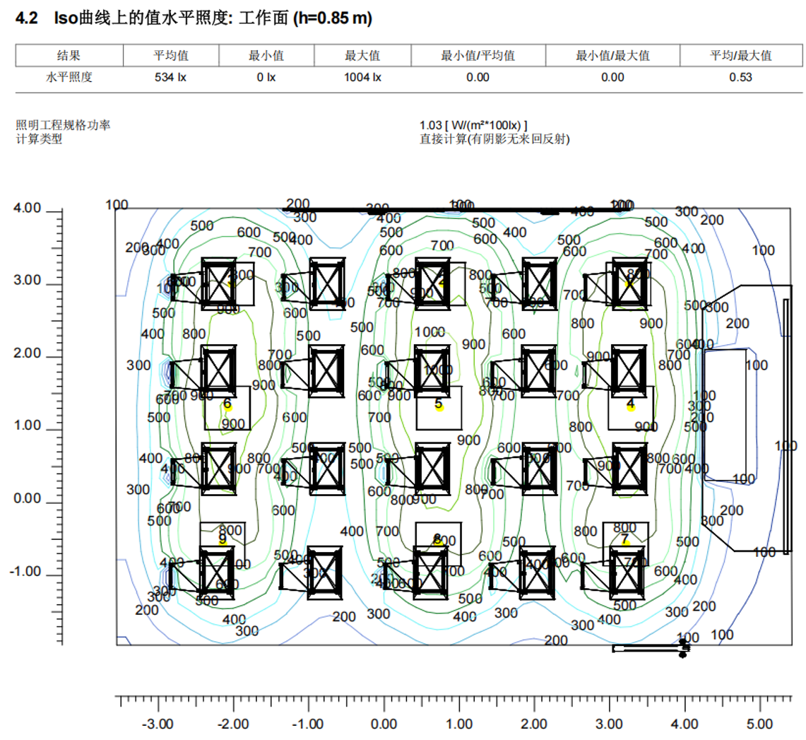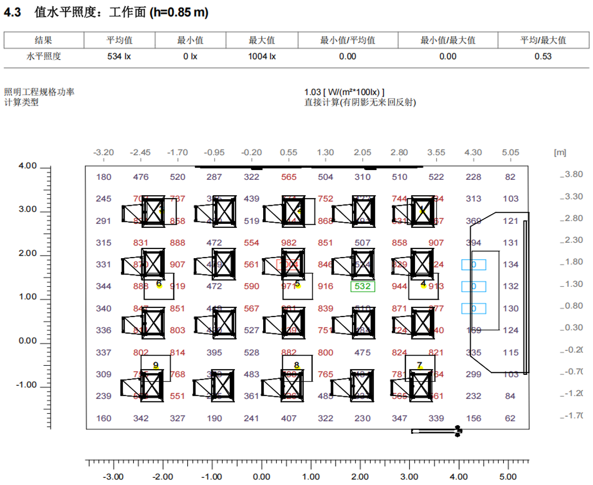 設計場所面積合理,其中布置燈具擺放合理,符合照明標準。