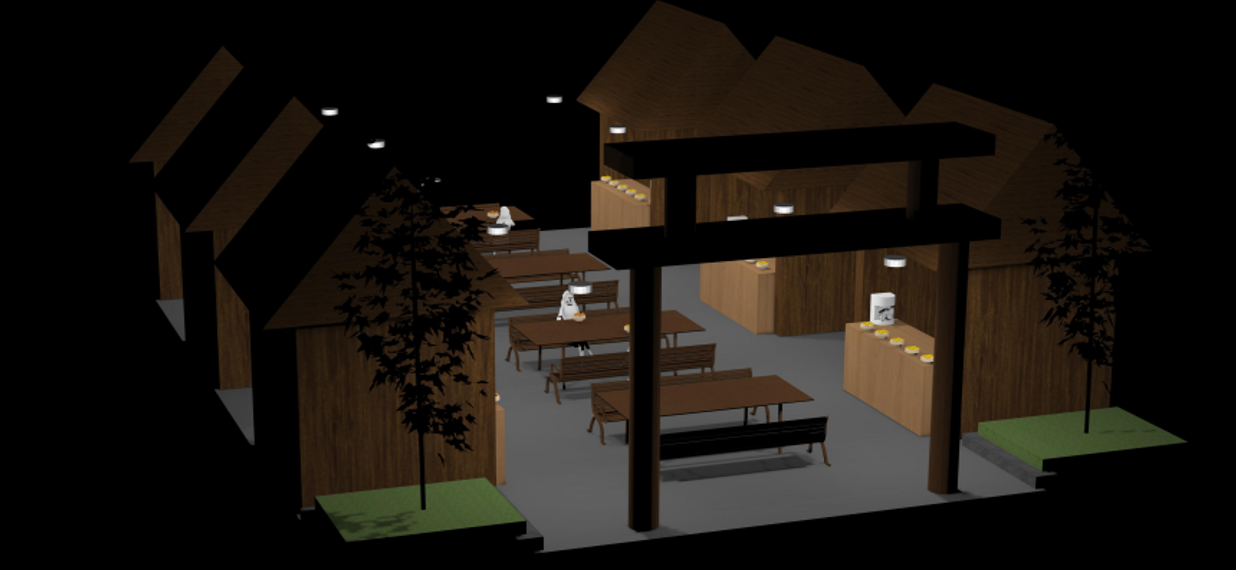 設計夜市面積合理,其中布置長椅、商鋪、植物等,燈具擺放合理,符合照明標準。