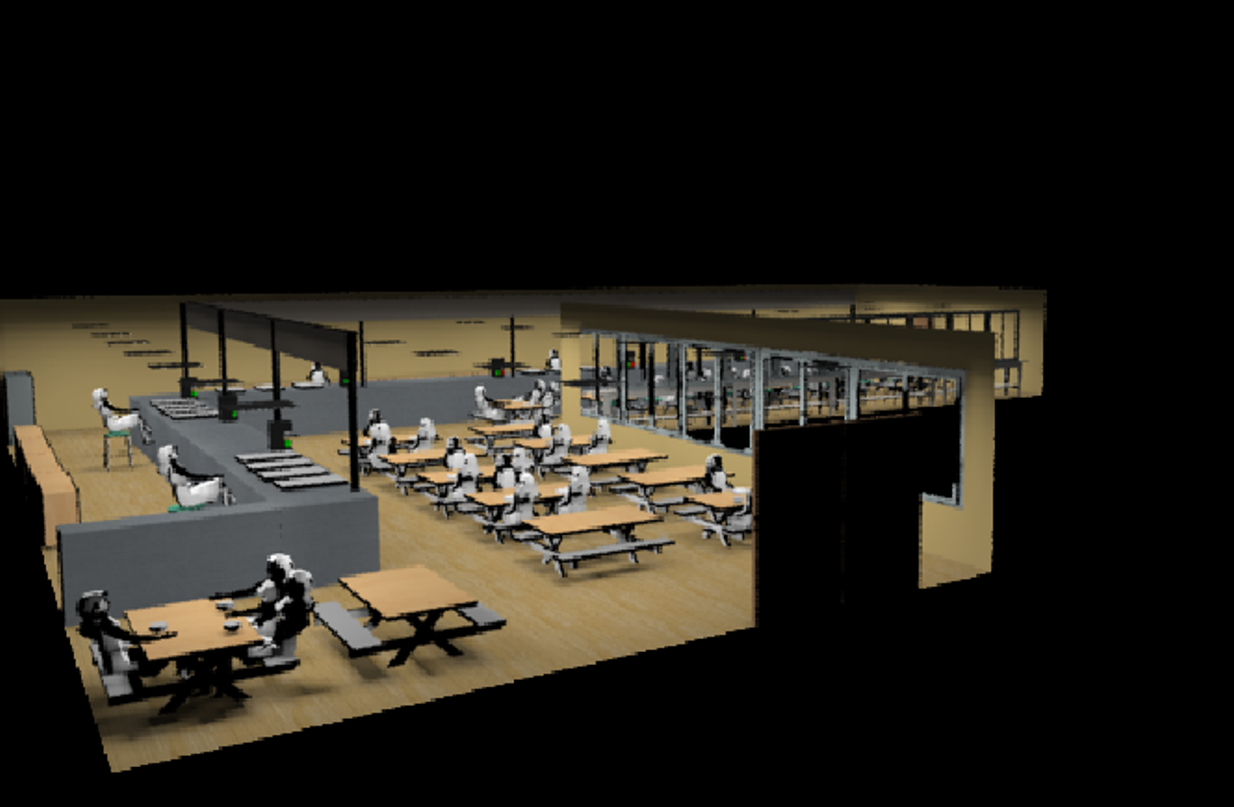 該渲染圖呈現(xiàn)了一個(gè)光線分布均衡、燈具擺放合理的學(xué)校餐廳場(chǎng)景,增強(qiáng)了場(chǎng)景的真實(shí)感。