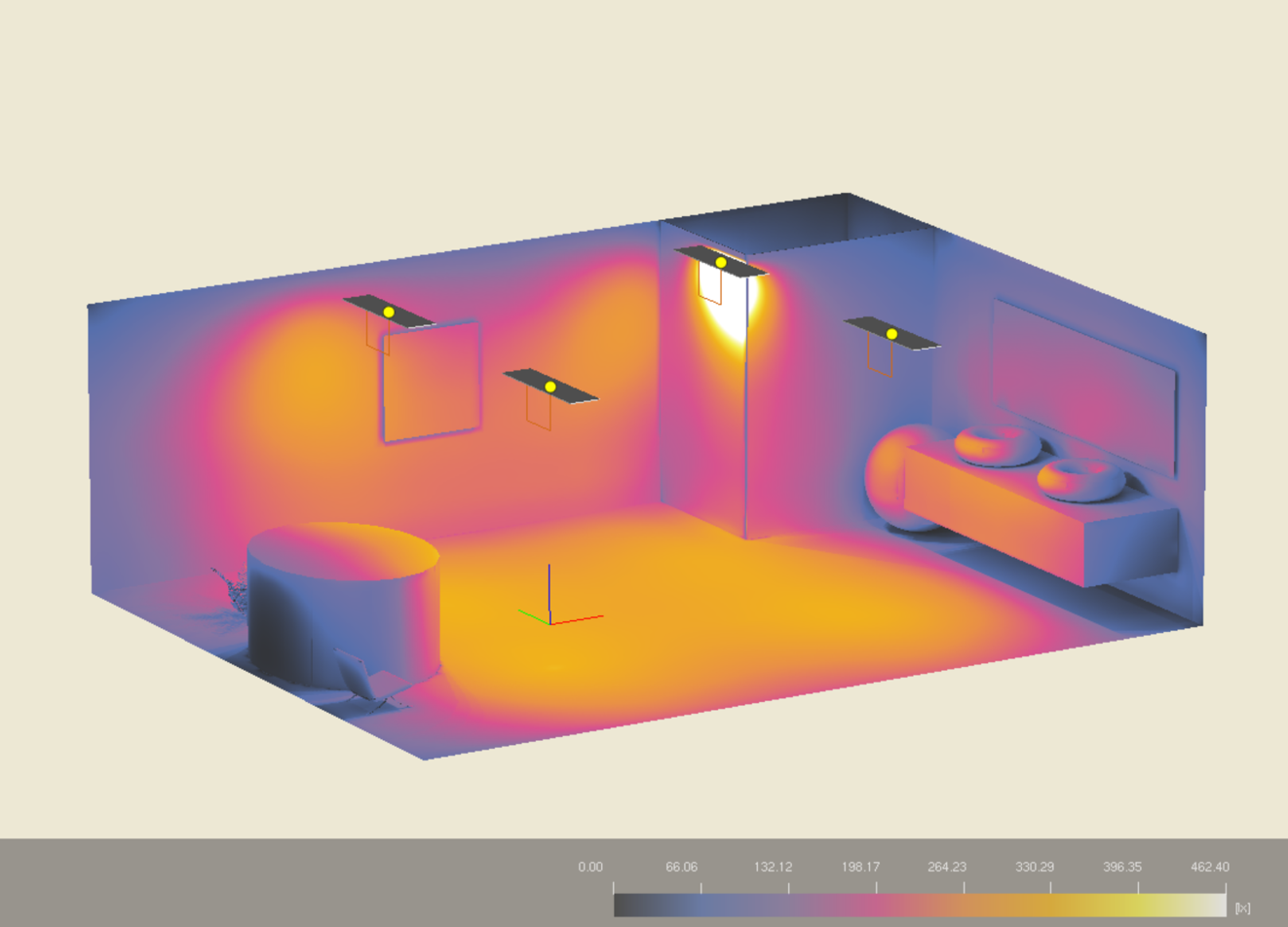 偽色彩圖顯示燈具所照射范圍基本為暖黃色到淡紫色,顏色過(guò)渡平緩,照度分布較為均勻
