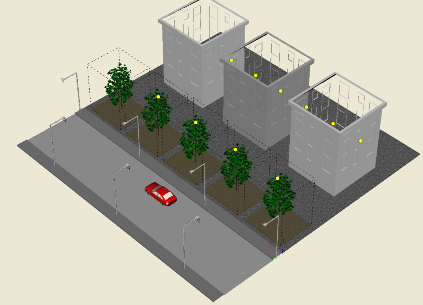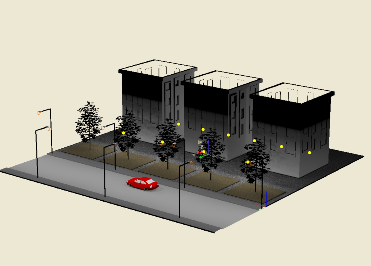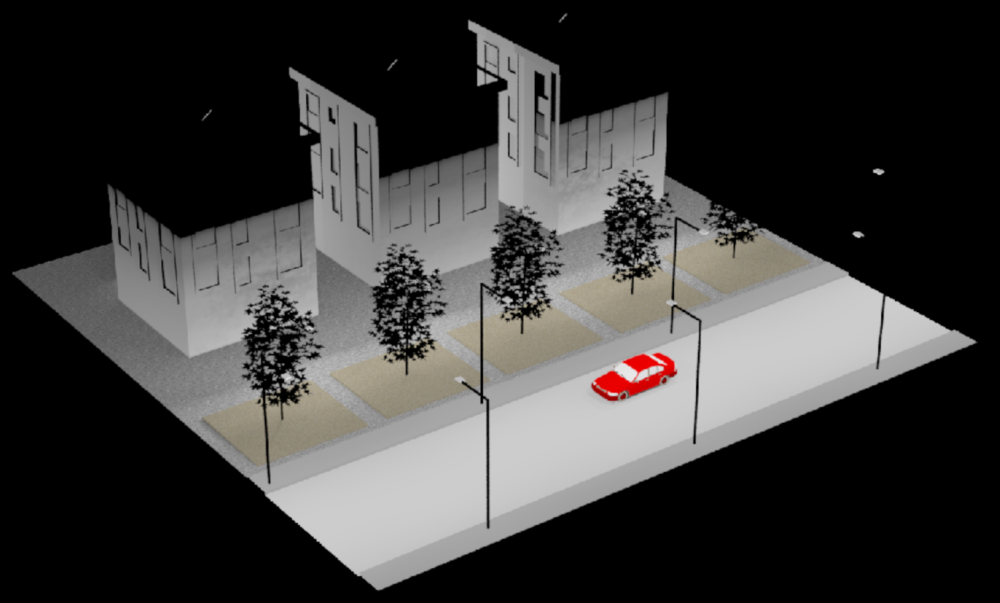 該渲染圖呈現了一個光線分布均衡、燈具擺放合理的建筑街道場景,增強了場景的真實感。