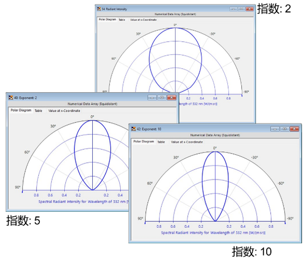 • 可自定義的指數(shù)讓您能夠模擬從廣泛的朗伯式到狹窄的高度定向發(fā)射曲線等各種發(fā)射模式。