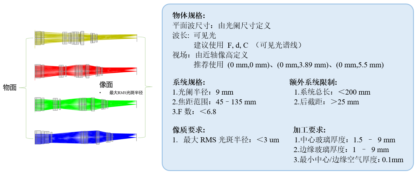 變焦鏡頭廣泛應(yīng)用于攝影、攝像以及機(jī)器視覺等領(lǐng)域,憑借其可變焦距設(shè)計(jì),實(shí)現(xiàn)了視場范圍的靈活切換與成像尺寸的自由調(diào)節(jié),兼具結(jié)構(gòu)緊湊、成像清晰和操作便捷等優(yōu)點(diǎn)。在本案例中,將通過設(shè)計(jì)一個典型的連續(xù)變焦鏡頭光學(xué)系統(tǒng),演示在 VLU 中的光學(xué)設(shè)計(jì)流程,包括初始結(jié)構(gòu)建立、像差分析、評價函數(shù)定義,優(yōu)化以及結(jié)果展示。