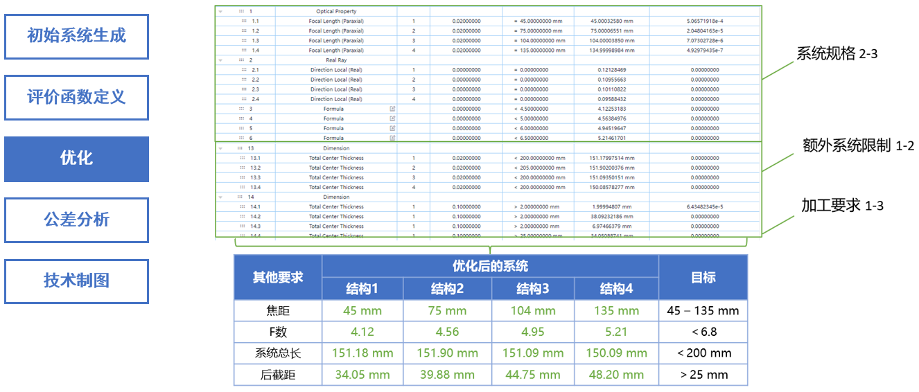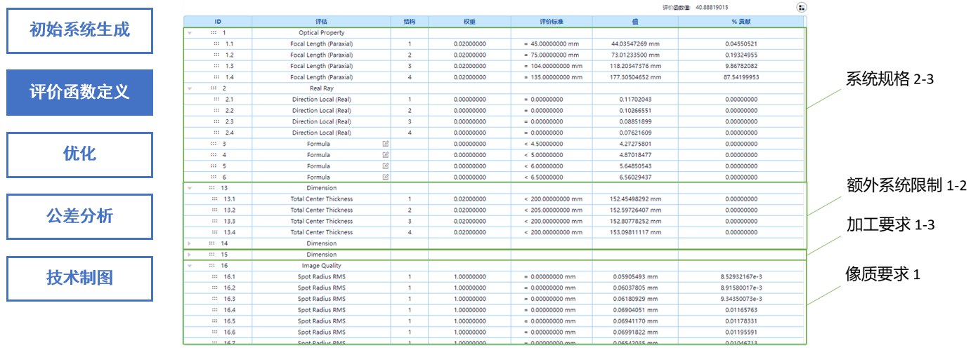 根據(jù)系統(tǒng)規(guī)格、額外系統(tǒng)限制以及像質(zhì)與加工要求,定義了各種與之對應(yīng)的評價函數(shù)。