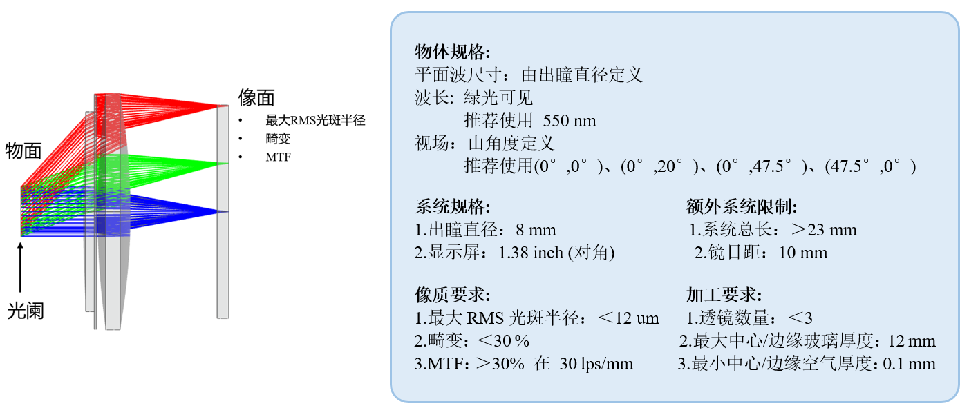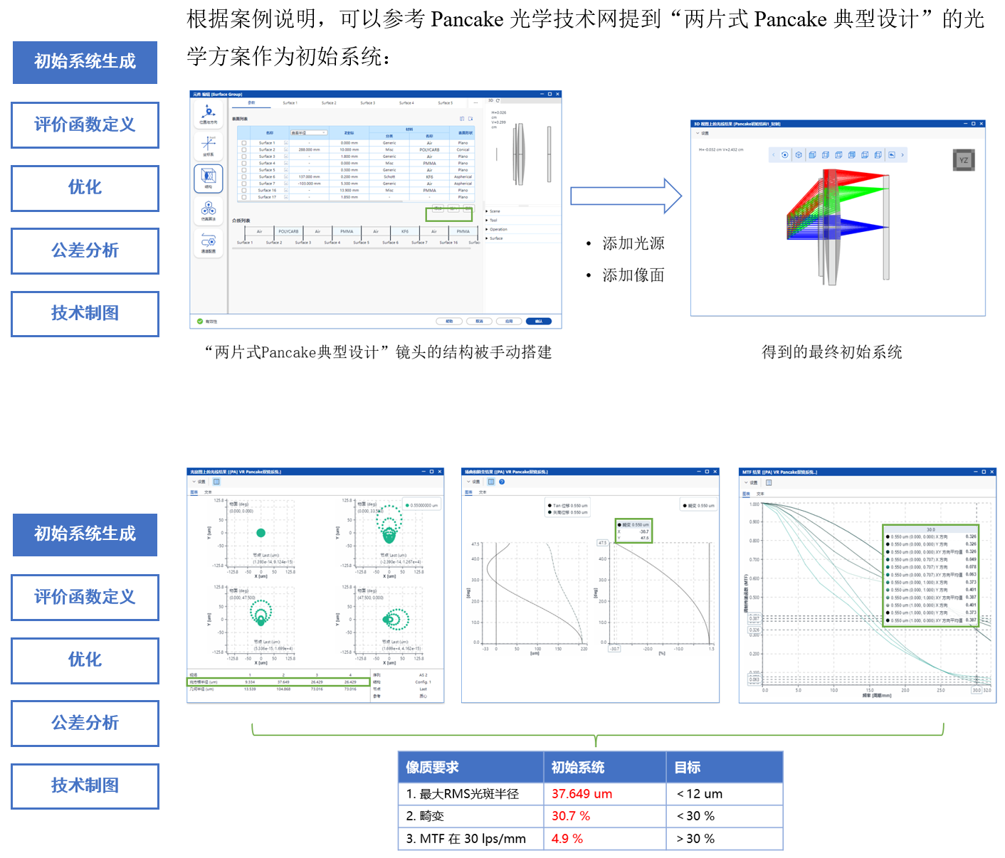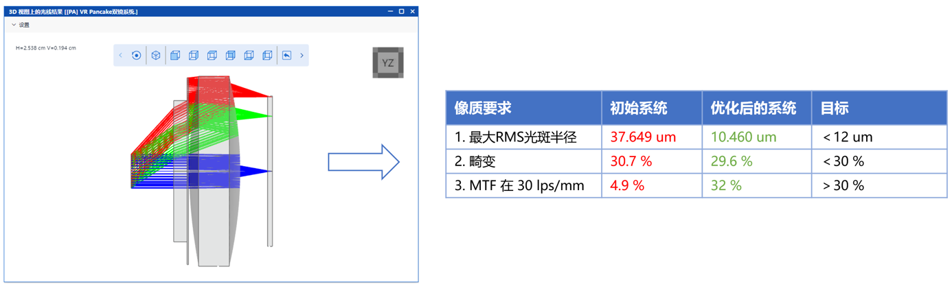 Pancake 鏡頭近年來在虛擬現實(VR)頭顯中得到越來越廣泛的應用。憑借將折疊光路的反射式光學結構與偏振光學元件(如PBS、λ/4波片)相結合的創新設計,該類鏡頭能夠在極大縮短系統光路長度的同時,實現高分辨率、低畸變的成像表現,從而顯著減小頭顯體積與重量。相比傳統菲涅爾透鏡(Fresnel Lens),Pancake 鏡頭具備更高的緊湊性、像質一致性以及邊緣清晰度優勢,但對制造精度與透光率控制要求更高。在本案例中,將通過設計一個典型的 Pancake 光學系統,演示在 VLU 中的光學設計流程,包括初始系統生成、像質分析、評價函數定義與優化。